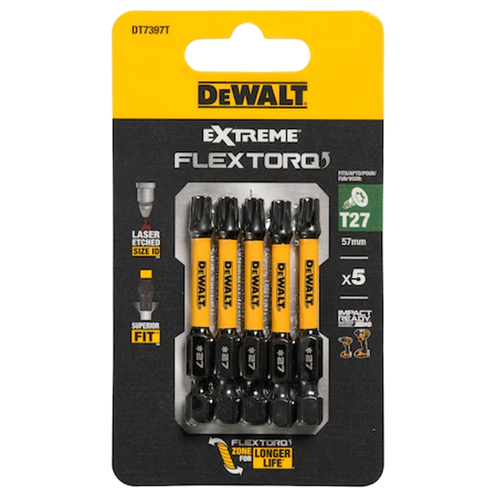 Набор бит DeWALT "FLEXTORQ" T27х57мм 5шт. DT7397T-QZ - рассчитаны на высокие нагрузки современных ударных шуруповертов. Это значительно снижает случаи поломки при фиксации больших винтов на месте.